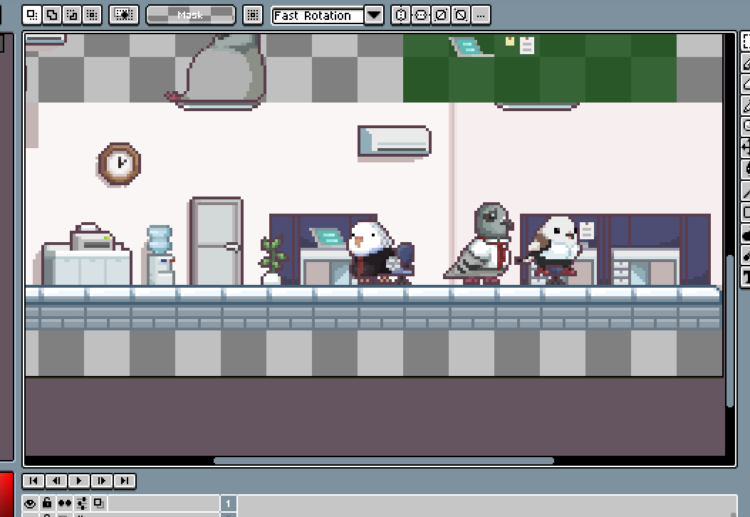 After finalising the character sprites, I shifted my focus to the environment to build the world of Bird Corp. Using Aseprite, I created a consistent tilemap system for the walls and floors to establish the office’s structure. My goal was to create distinct zones that feel like a functioning workplace, starting with the Boss’s Office. I designed this space to feel authoritative yet quirky, featuring a large executive desk for the Eagle character and a panoramic window view. I also added small details like a parody “Mona Lisa” bird painting to add personality to the setting.